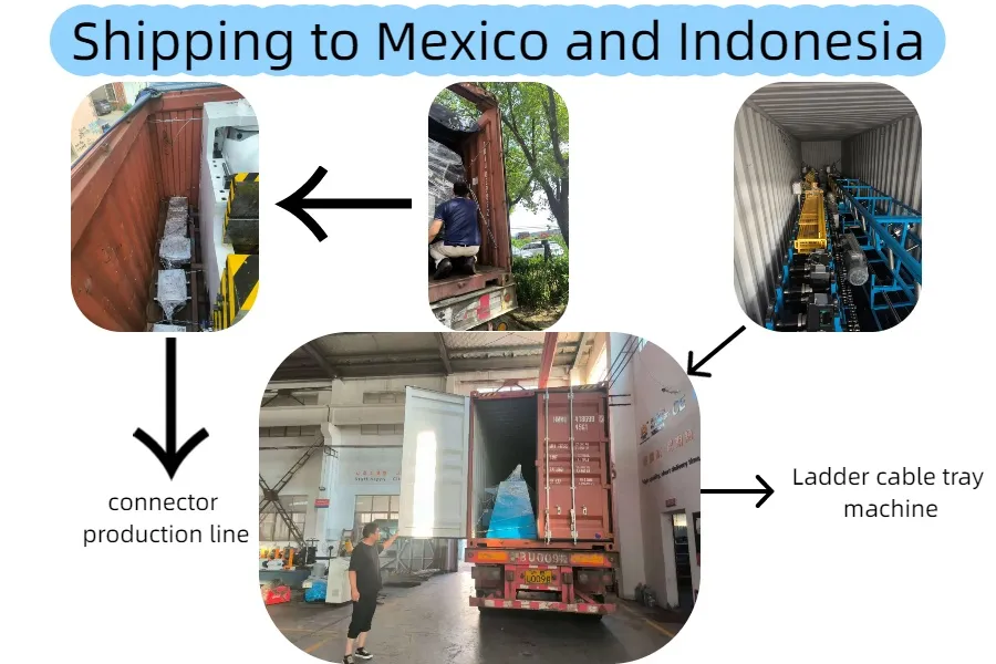 Logistics teams coordinated both shipments to ensure timely and secure delivery. The connector production line components were carefully packed in wooden crates with corrosion protection, while the three cable tray machines were securely fastened and wrapped for safe transport over long distances.