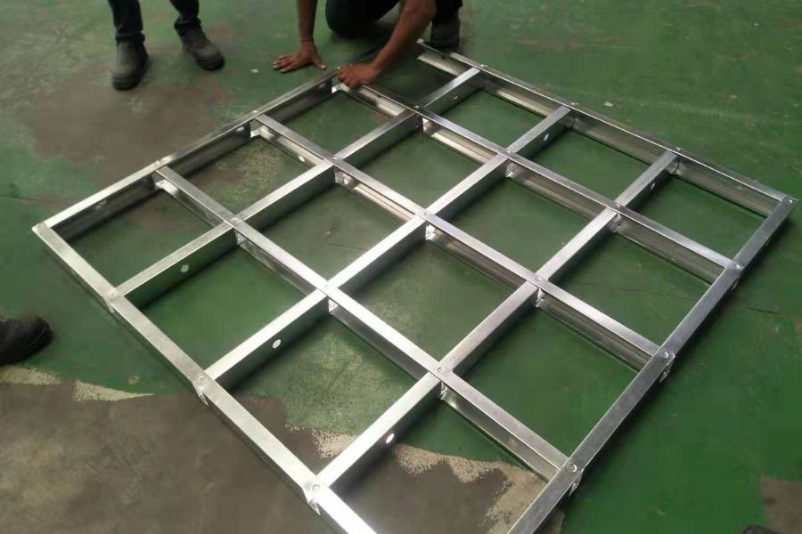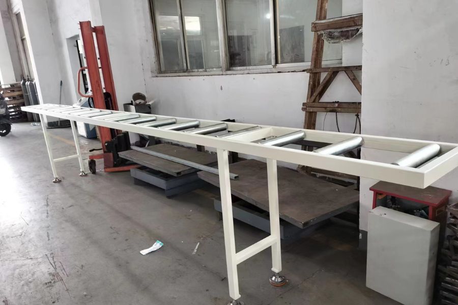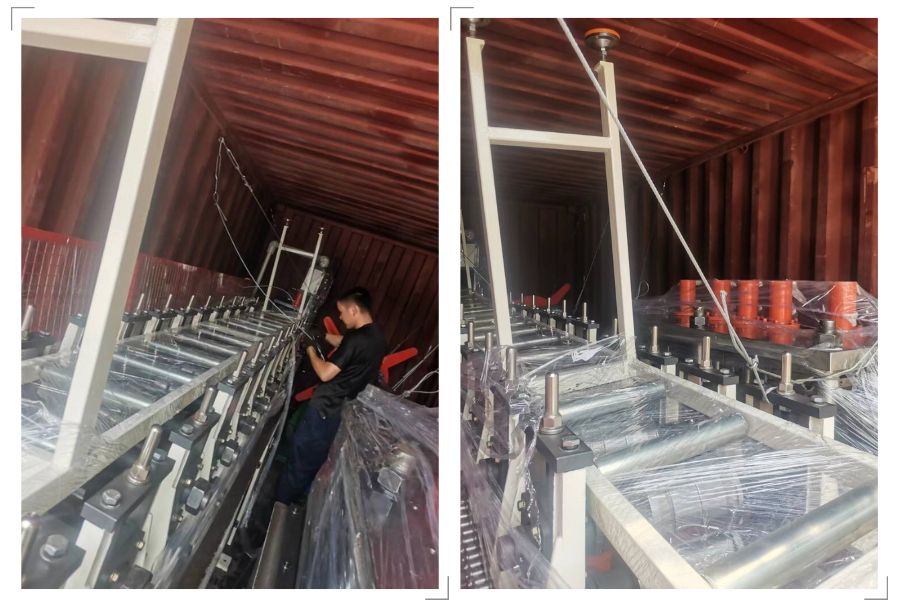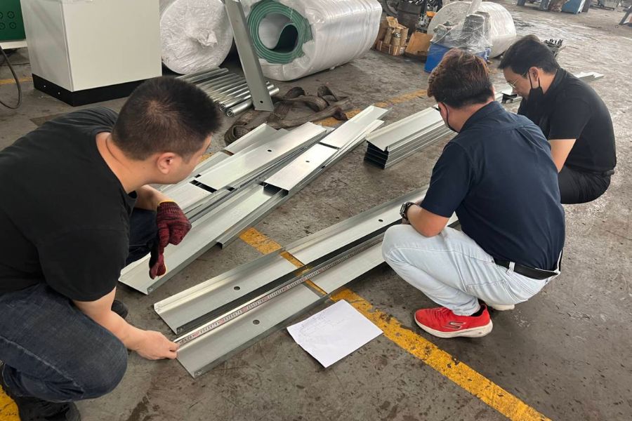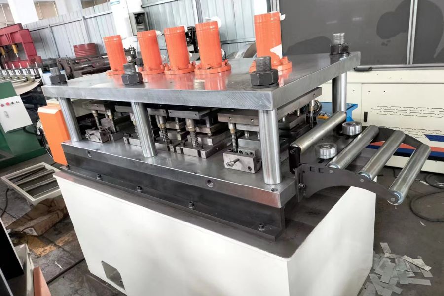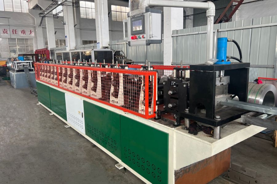 This production line includes 3 tons hydraulic decoiler, servo feeding device and hydraulic punching device, main roll forming machine, hydraulic cutting, 6 meters passive output table, control box, spare parts.