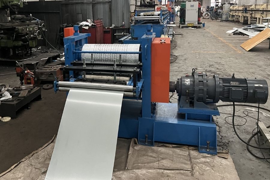 The production line includes 5 tons hydraulic decoiler, 3 sets of embossing machine, 2 sets of roll forming machines, pre-heating platform, PU foamed system, 30 meters laminator(aluminum block), band saw servo following cutting and 6 meters ouput table.