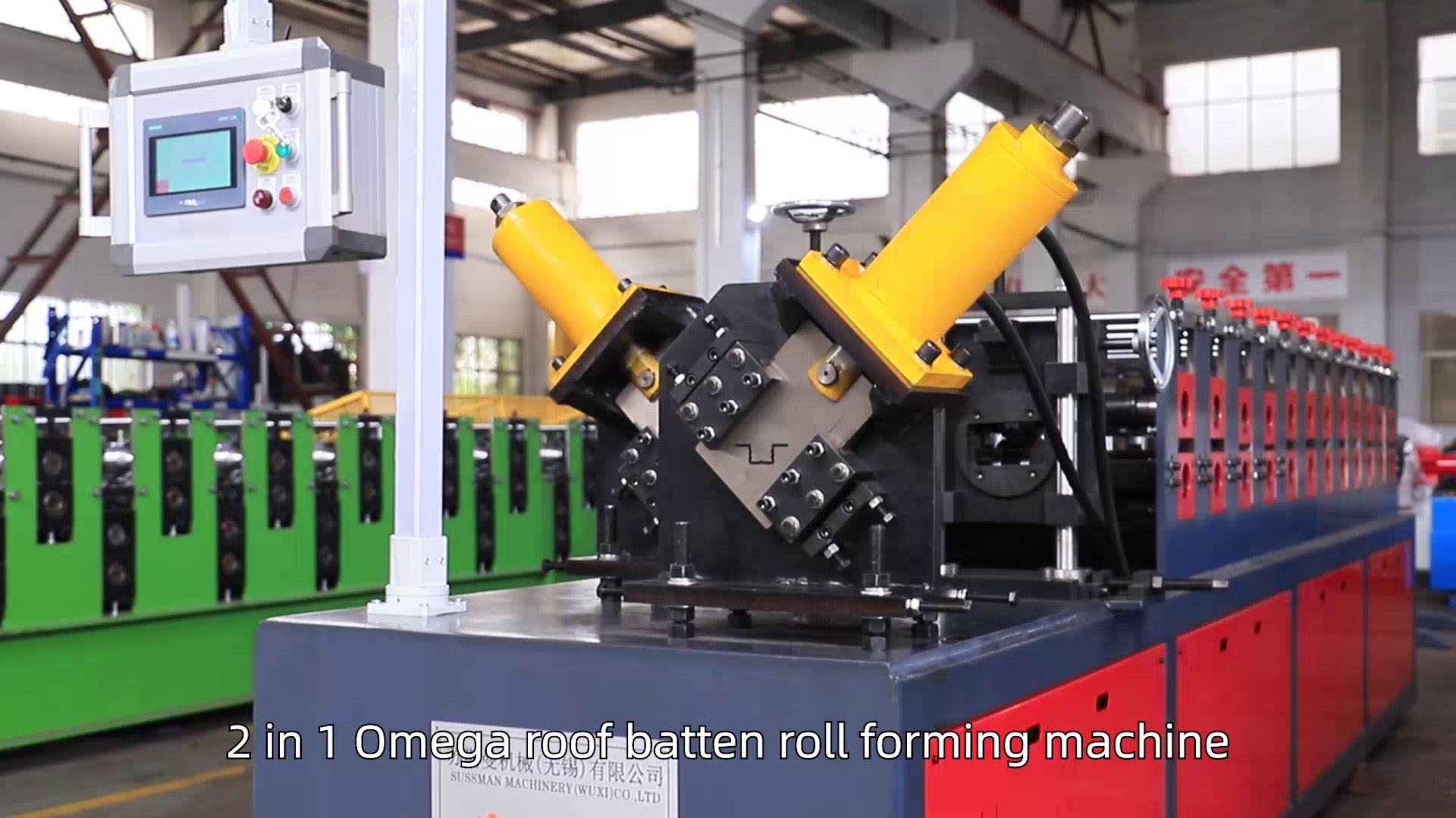 2 in 1 Omega roof batten roll forming machine can make 2 profile in one machine,it can shave the motor,the control box and the bending.This machine can save the place ,power and easy to operate.