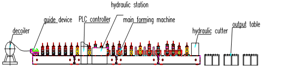 Uncoiling—Feeding&Leveling ---Roll forming—Cutting—Products collecting