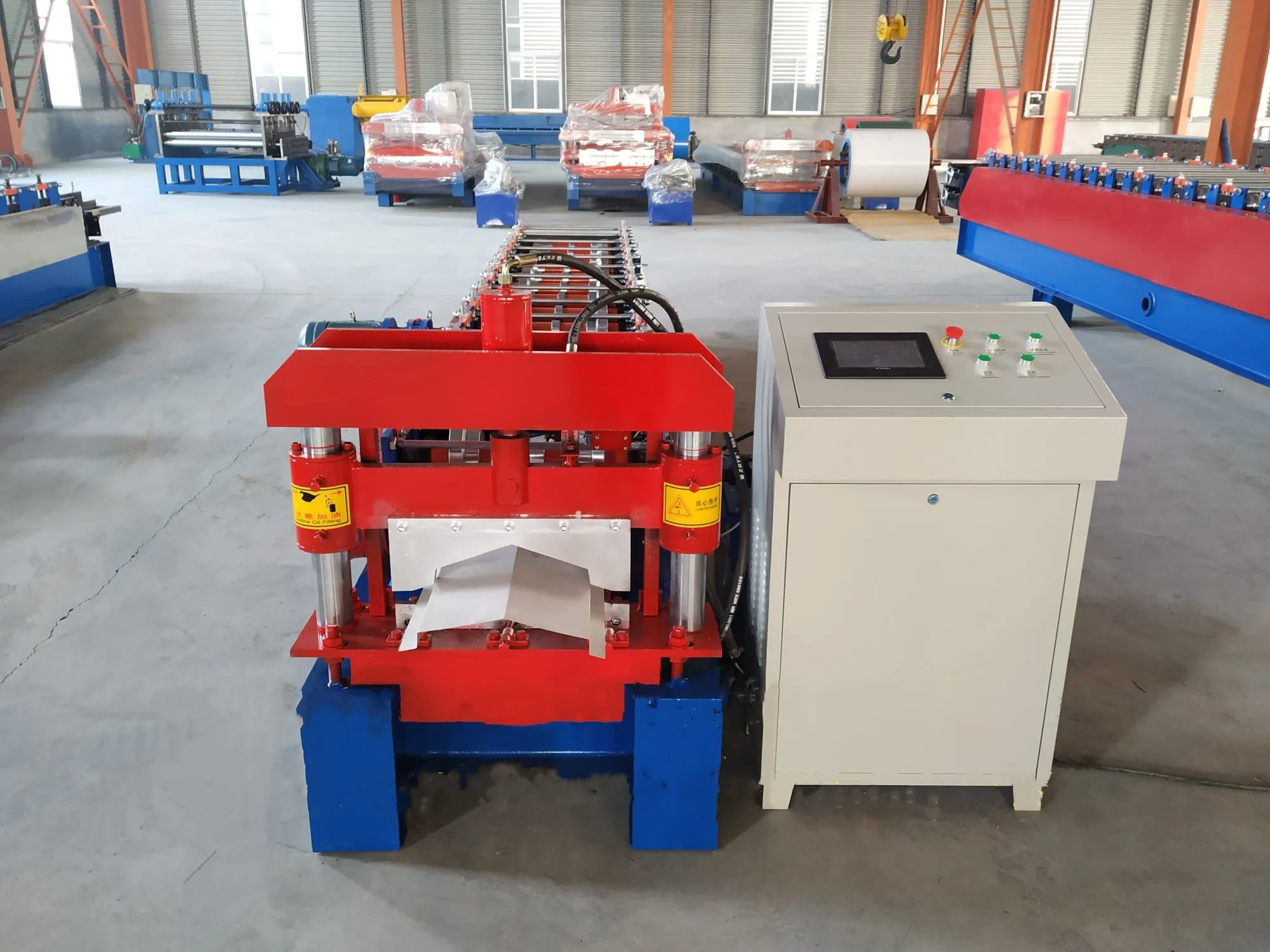 Ridge capping machine can do material thickness 0.3-0.8mm, the raw material could be Zinacalume, Colorbond Steel, Galvanised,PPGI, Aluminum, it is designed for roofs that require a wider flange or do not have a conventional roof pitch.