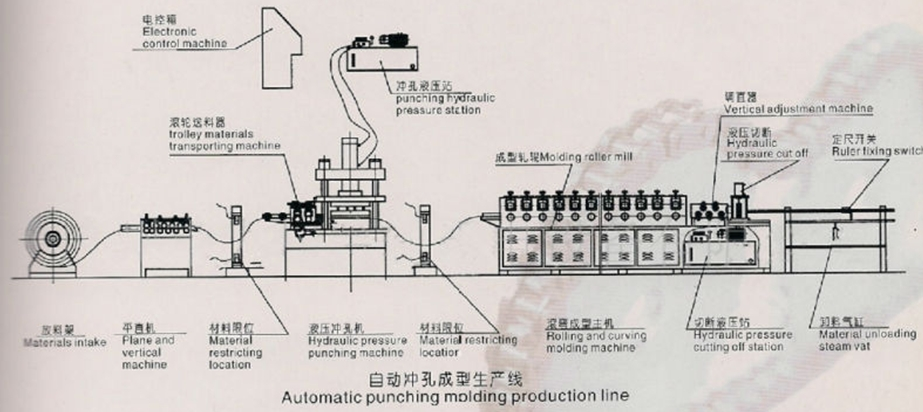 5 tons Electrical De-coiler——→ Servo feeding—→ Hydraulic punching—→Main roll forming machine—→Hydraulic cutting-- Conveyor belt---Bending one side--Bending two sides—→ Run out tables