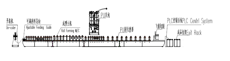 Decoiler—feedingdevice—mainforming—PUinjection---straightendevice——FlysawCutting ---run out table